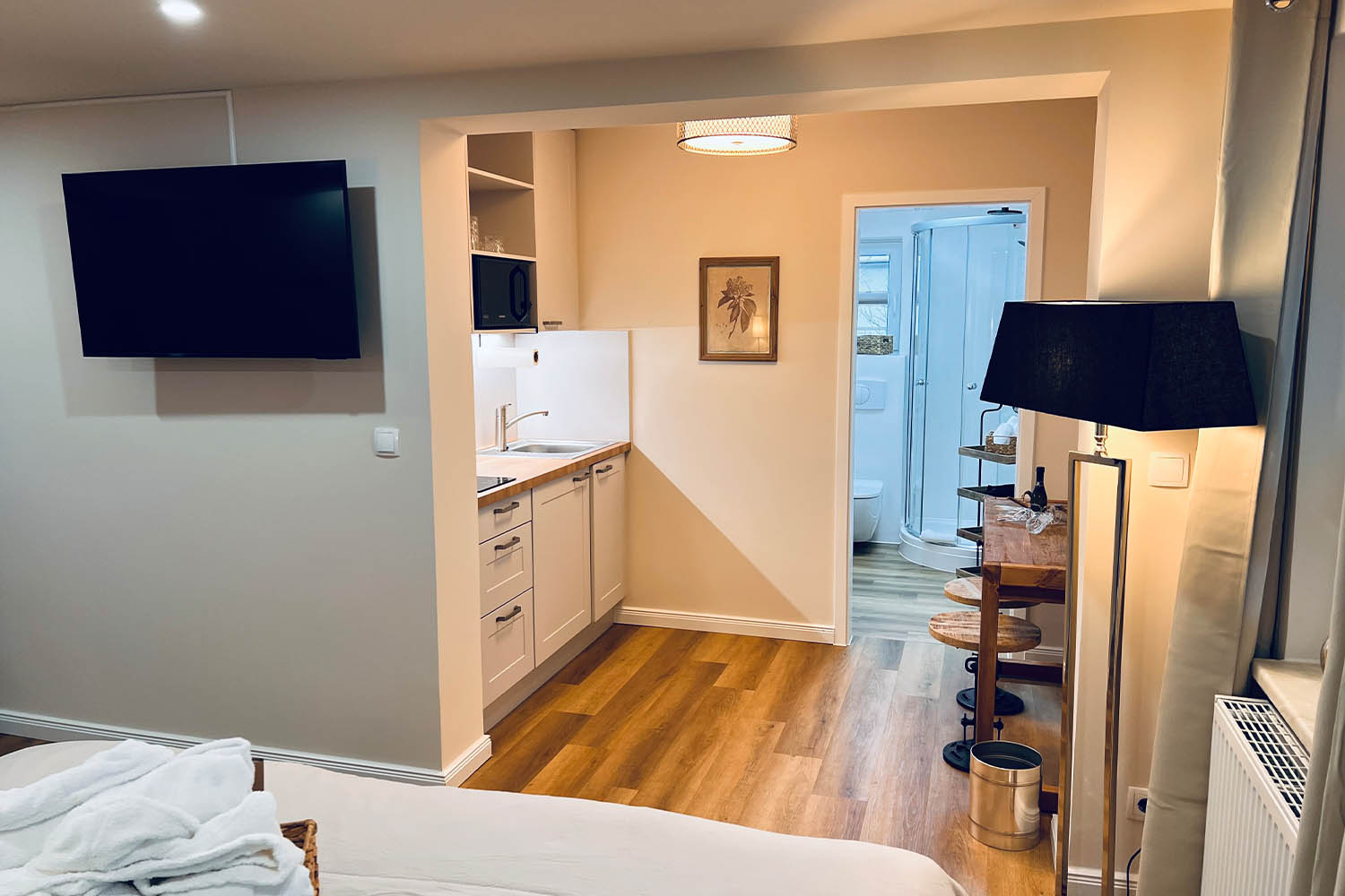 - vollausgestattete Pantryküche inkl. Mikrowelle mit Grillfunktion, Wasserkocher, Kühlschrank, Induktionsplatte, Toaster, Filterkaffeemaschine, Filtertüten, Küchenrolle, Geschirrhandtuch, Abwaschlappen und Spülmittel