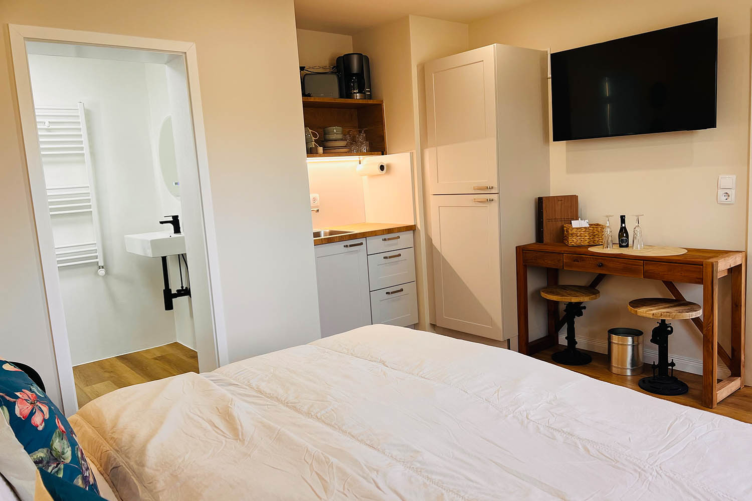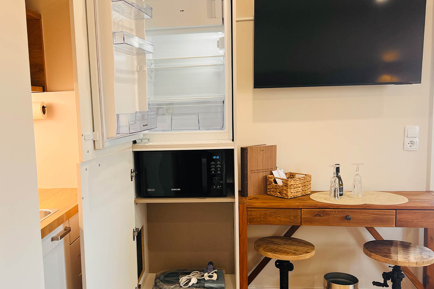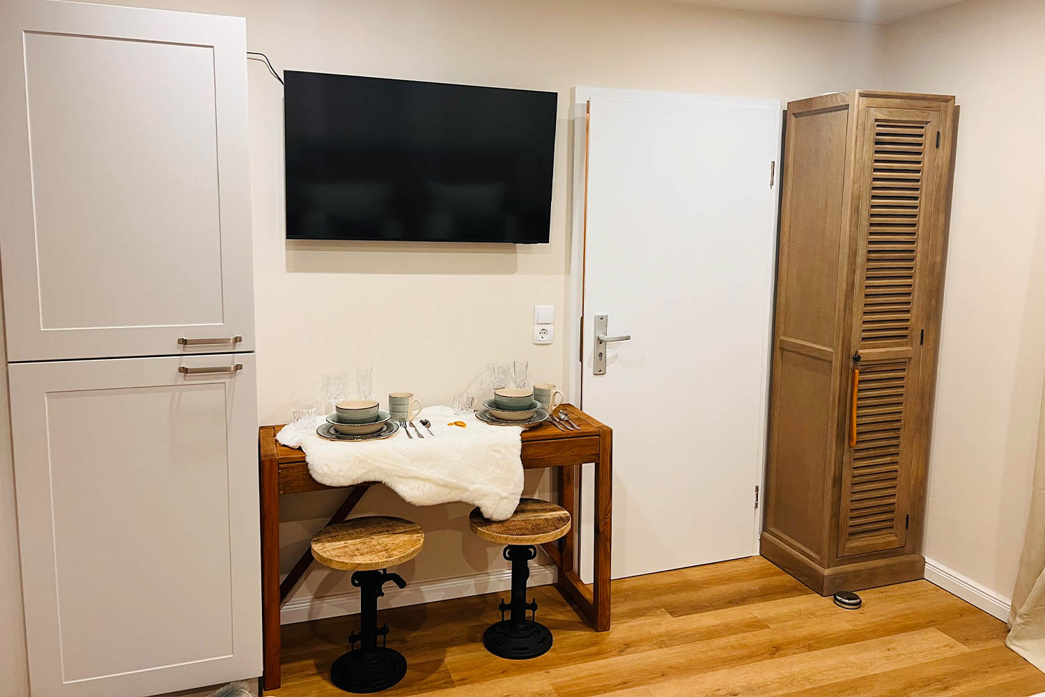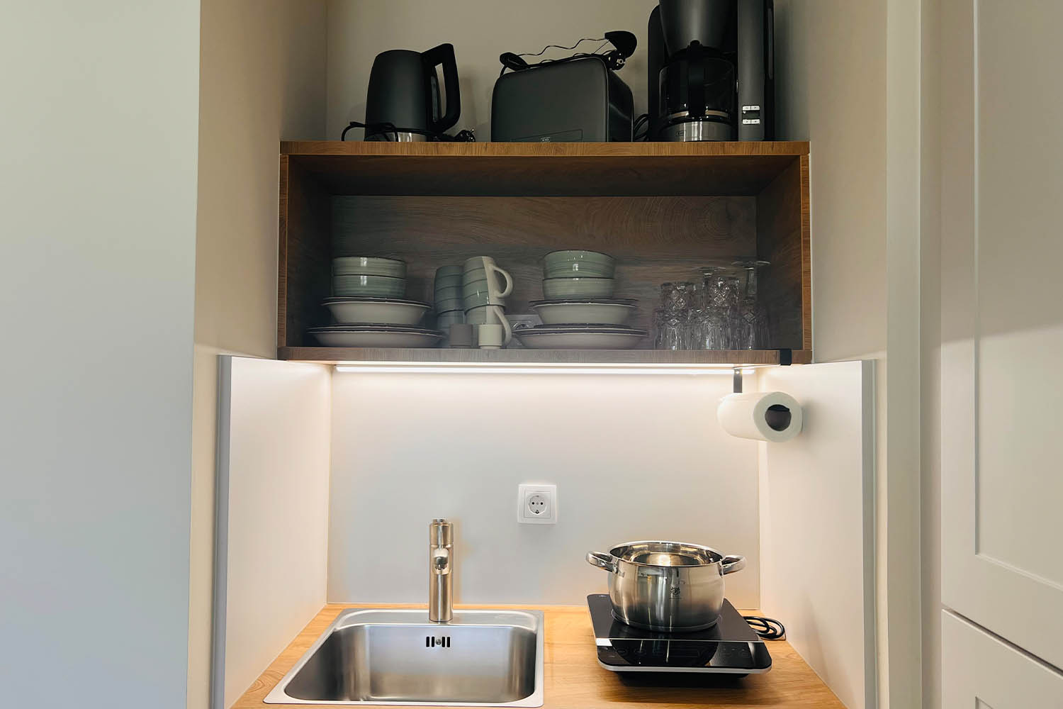 - vollausgestattete Pantryküche inkl. Mikrowelle mit Grillfunktion, Wasserkocher, Kühlschrank, Induktionsplatte, Toaster, Filterkaffeemaschine, Filtertüten, Küchenrolle, Geschirrhandtuch, Abwaschlappen und Spülmittel