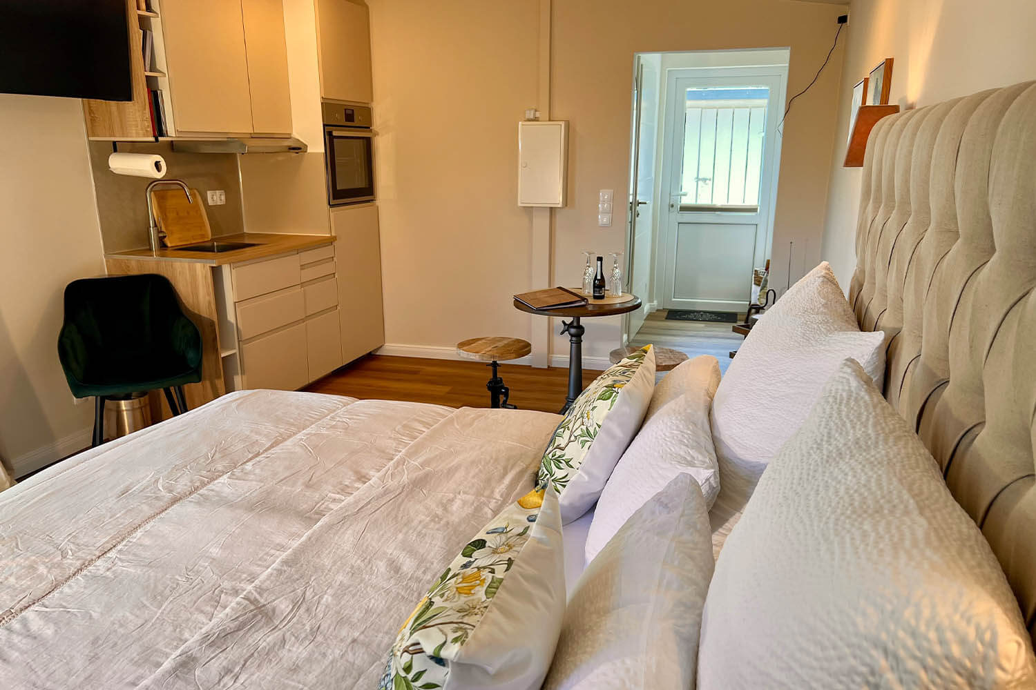 - vollausgestattete Pantryküche inkl. Mikrowelle mit Grillfunktion, Wasserkocher, Kühlschrank, Induktionsplatte, Toaster, Filterkaffeemaschine, Filtertüten, Küchenrolle, Geschirrhandtuch, Abwaschlappen und Spülmittel