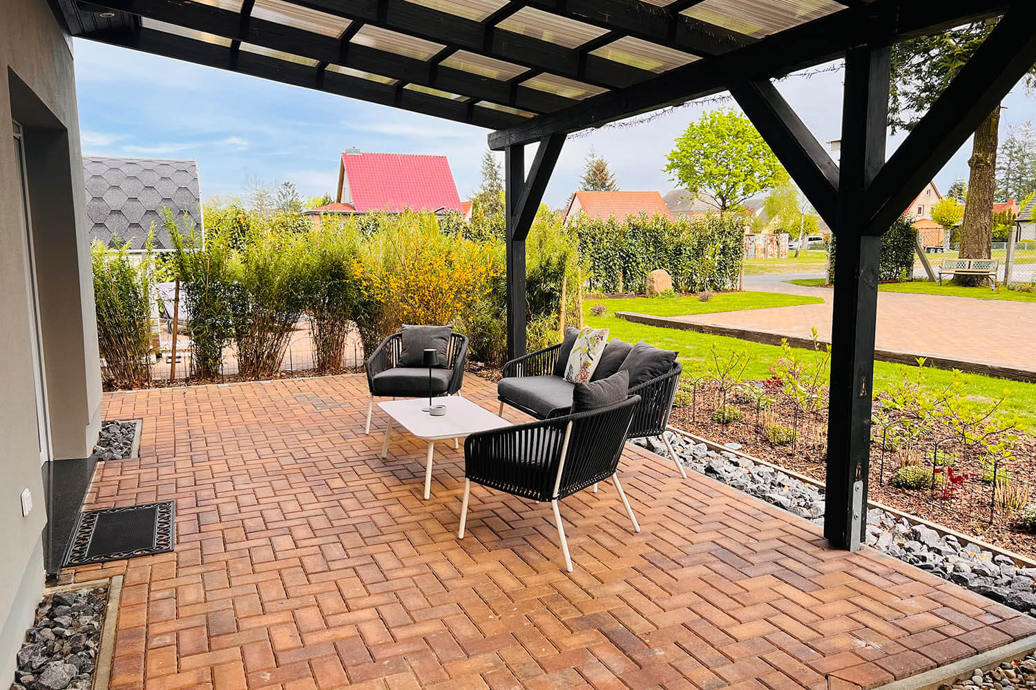 - Sitzmöglichkeiten mit Tisch vor dem Haus
