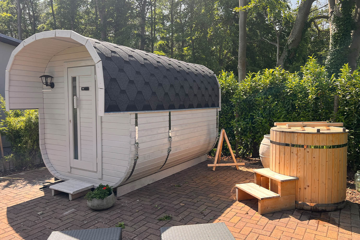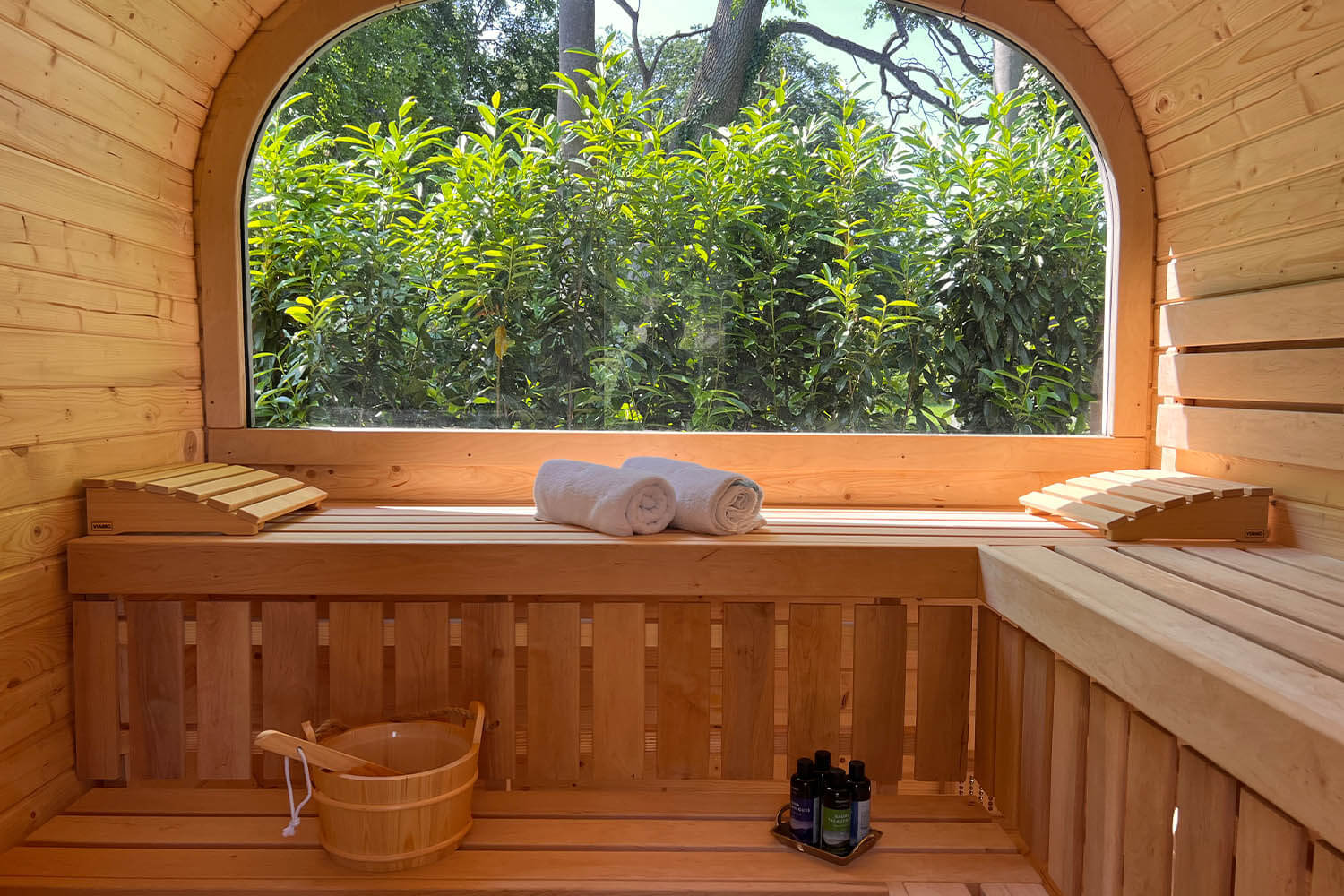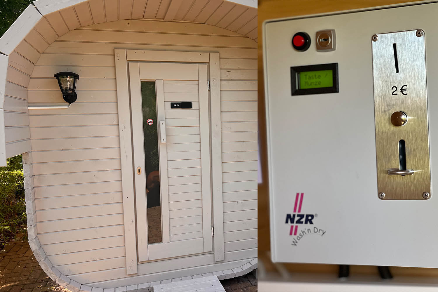 - Sauna im Außenbereich (8 €/2h, Münzautomat – 2 € Münzen, inklusive Vorlaufzeit) inkl. Tauchbecken